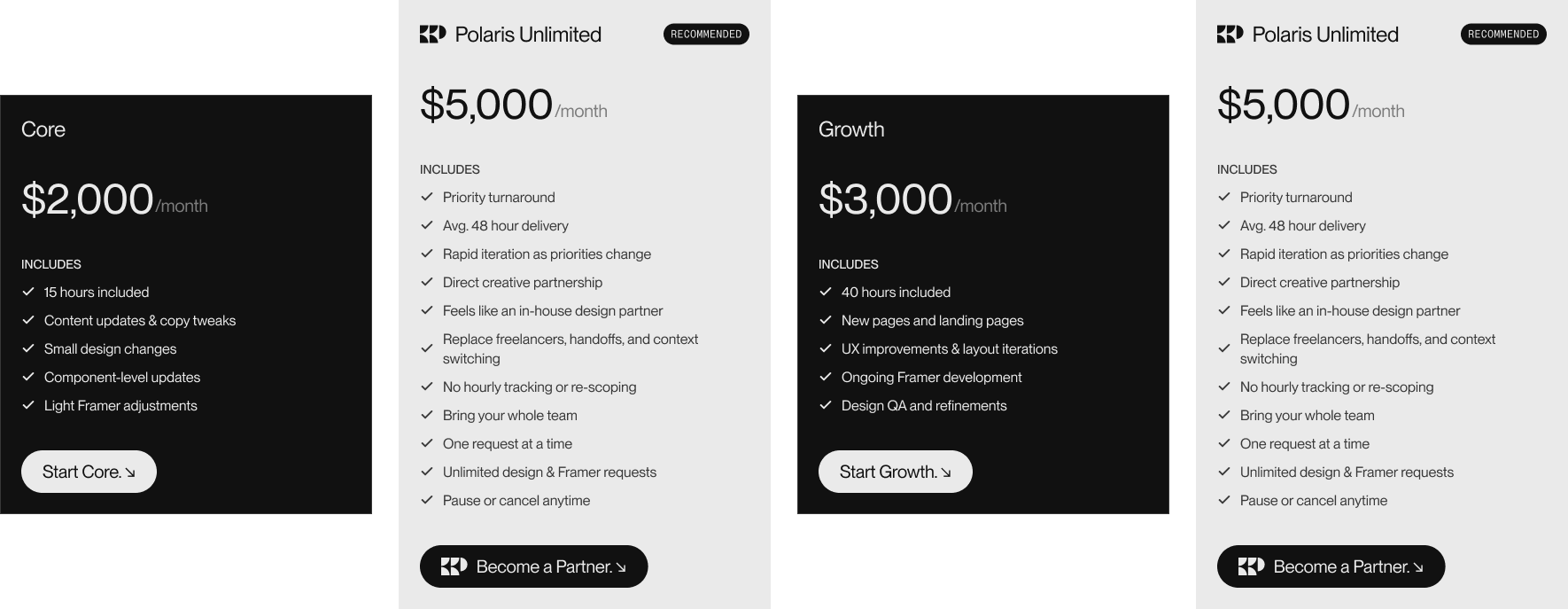 Choose a plan, get onboarded quickly, and we start shipping. Core and Growth are hour based. Polaris Unlimited runs on a simple request queue.
